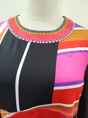 Shift print dress with pink combinations and a boat neckline, three quarter sleeves and small zip at back neckline